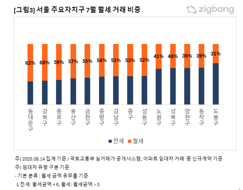 반면 도봉구·동작구·양천구·성북구·노원구 등은 여전히 전세 비중이 절반 이상으로 나타나고 있다. 이는 지역별 수급 상황이나 가격대, 주거 선호도에 따라 임대차 시장의 변화 양상이 다르게 나타나고 있음을 보여준다.