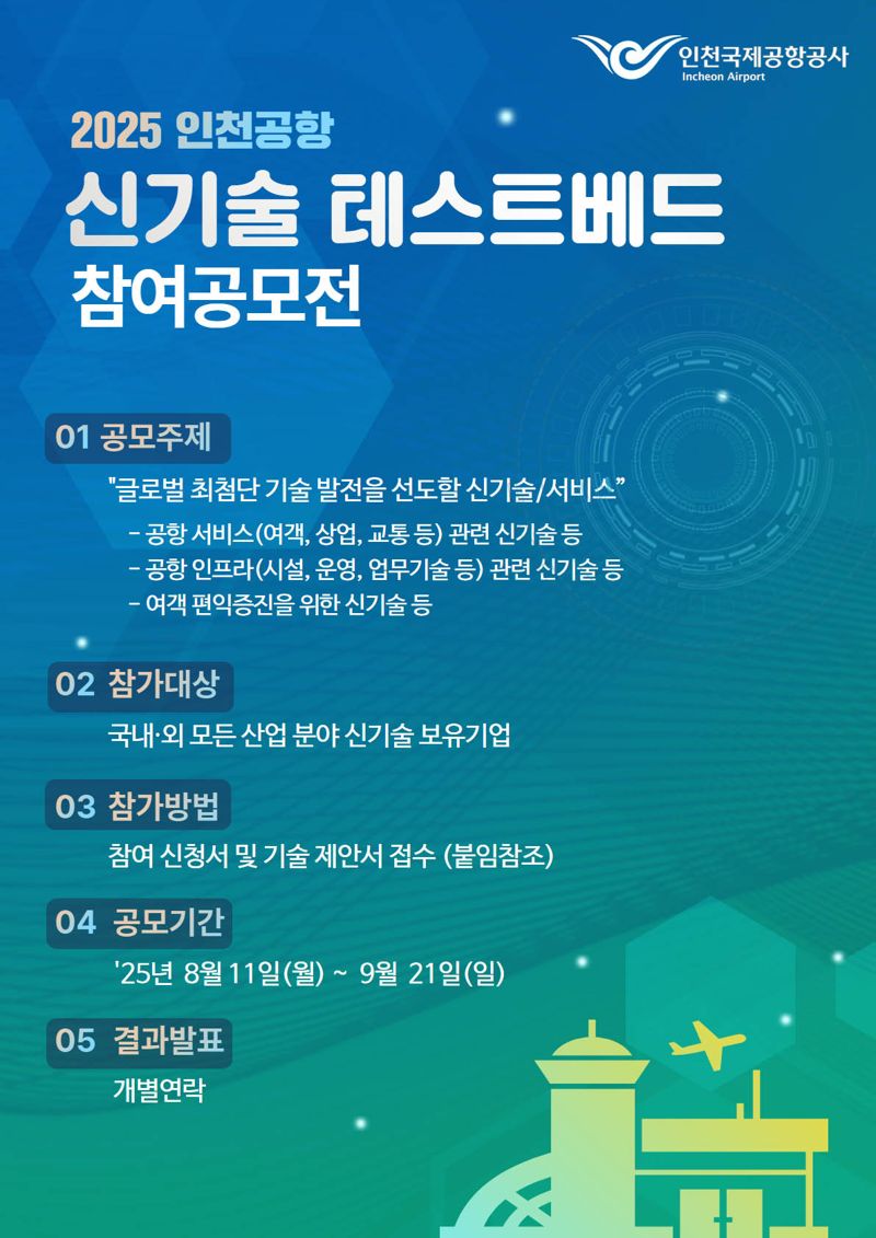 [파이낸셜뉴스] 인천국제공항공사는 인천공항의 인프라를 국내·외 기업에 개방해 최첨단 기술의 실증을 지원하는 '2025 인천공항 신기술 테스트베드 공모전'을 시행한다고 18일 밝혔다.