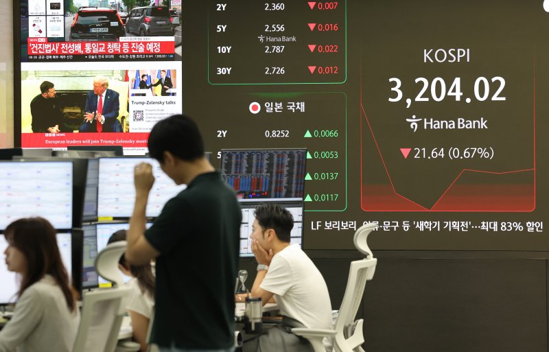 시가총액 상위 종목에서는 한화오션(2.44%), HD현대중공업(1.47%), NAVER(0.45%) 등이 오름세고 KB금융(-4.68%), SK하이닉스(-2.71%), 신한지주(-2.32%) 등이 내림세를 보이고 있다.