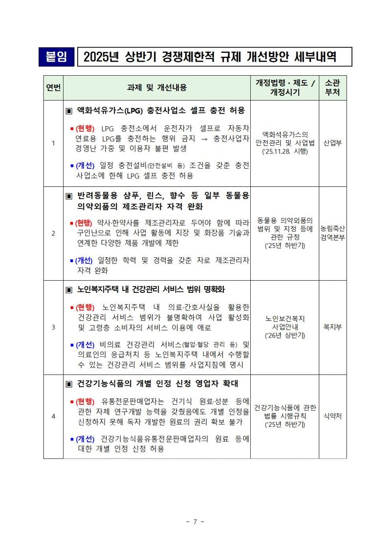 △액화석유가스(LPG) 충전소의 셀프 충전 허용 △반려동물 샴푸 등 제조관리자 자격 완화 △노인복지주택 내 건강관리 서비스 범위 명확화 △건강기능식품의 원료·성분 등 개별 인정 신청 가능 사업자 범위 확대 등이다.