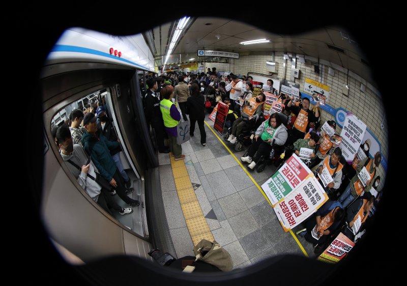 [파이낸셜뉴스] 전국장애인차별철폐연대(전장연)의 시위로 지하철 4호선 열차가 명동역을 1시간 동안 서지 않고 통과했다.