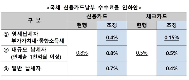 다만, 연매출 1000억원 이상인 대규모 납세자는 인하 대상에서 제외돼 기존 수수료율(신용카드 0.8%, 체크카드 0.5%)이 유지된다.