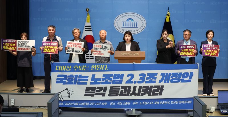 전국민주노동조합총연맹(민주노총) 노조법2·3조 개정운동본부는 18일 오전 국회 소통관에서 기자회견을 열고 "노조법2·3조 개정안이 8월 임시국회 본회의 통과를 앞두고 있다"며 "국회는 지금 당장, 후퇴 없이 노조법을 개정하라"고 말했다.