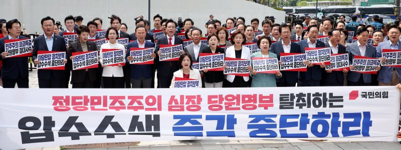 [파이낸셜뉴스] 국민의힘이 특검 대응에 집중하고 있다. 김건희 여사 관련 의혹을 수사하는 민중기 특검팀 사무실과 국민의힘 중앙당사 압수수색 영장을 발부한 서울중앙지법 인근에서 현장 비상의원총회를 열어 총력 투쟁에 나섰다. 특검 수사의 칼날이 윤석열 전 대통령 부부를 넘어 국민의힘을 겨누면서 당분간 특검 대응에 당력을 집중하겠다는 방침이다. 특검 수사가 당 최대 현안으로 떠오른 만큼 국민의힘 전당대회에도 영향을 미치는 모양새다.