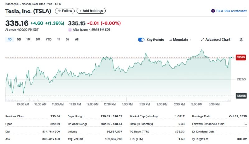 일단 테슬라는 1.39% 상승한 335.16달러를 기록했다. 이로써 시총도 1조810억달러로 늘었다.