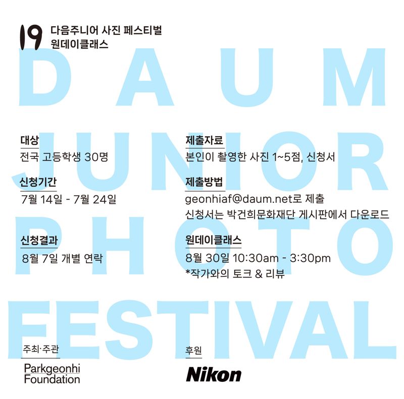 2007년 시작된 ‘다음주니어 사진 페스티벌’은 박건희 문화재단이 주최 및 주관하는 청소년 사진문화 교육 프로그램으로, 니콘이미징코리아가 첫 해부터 꾸준히 후원해오고 있다. 매년 사진 공모를 통해 선발된 학생들을 대상으로 사진 교육, 전시, 실습 등 다양한 실전 경험의 장을 제공하며 청소년 작가들의 성장을 돕고 있다.