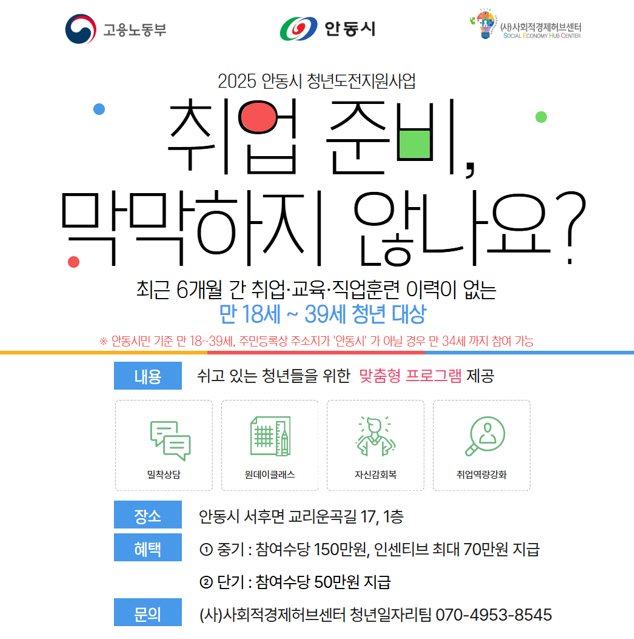 이 사업은 18~39세 안동시민 중 최근 6개월 이상 취업·교육·훈련에 참여하지 않은 청년을 대상으로 심리 상담, 동기 부여, 직업역량 강화 프로그램 등을 지원하는 것이다.
