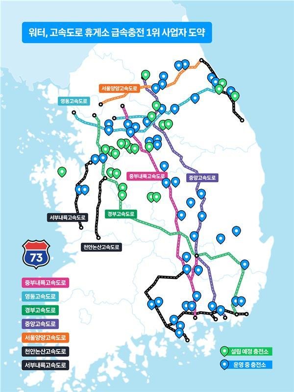 또 워터가 운영하고 있는 기존 휴게소 1곳에 멀티 충전기 1기가 추가 설치될 예정으로 이날 기준 총 73개소·397기의 운영 및 파이프라인을 확보했다.