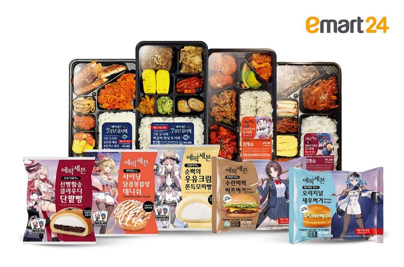 출시 상품은 '타마린느의 샤이닝 달콤몽블랑데니쉬'(2200원) '조장아룬카의 선빨필승! 클라우디단팥빵'(3000원) '안젤리카의 순백의 우유크림쫀득모찌빵'(1900원) '유피네의 고기고기고기도시락'(5300원) '켄의 반반고기정찬도시락'(5300원) '7찬도시락 떡갈비한상'(5300원) '7찬도시락 든든한제육&돈까스정식'(5600원) '전학생 아딘의 수련비책 비프버거'(3800원) '해군대령 랑디의 오리지널새우버거'(3600원) 등이다.