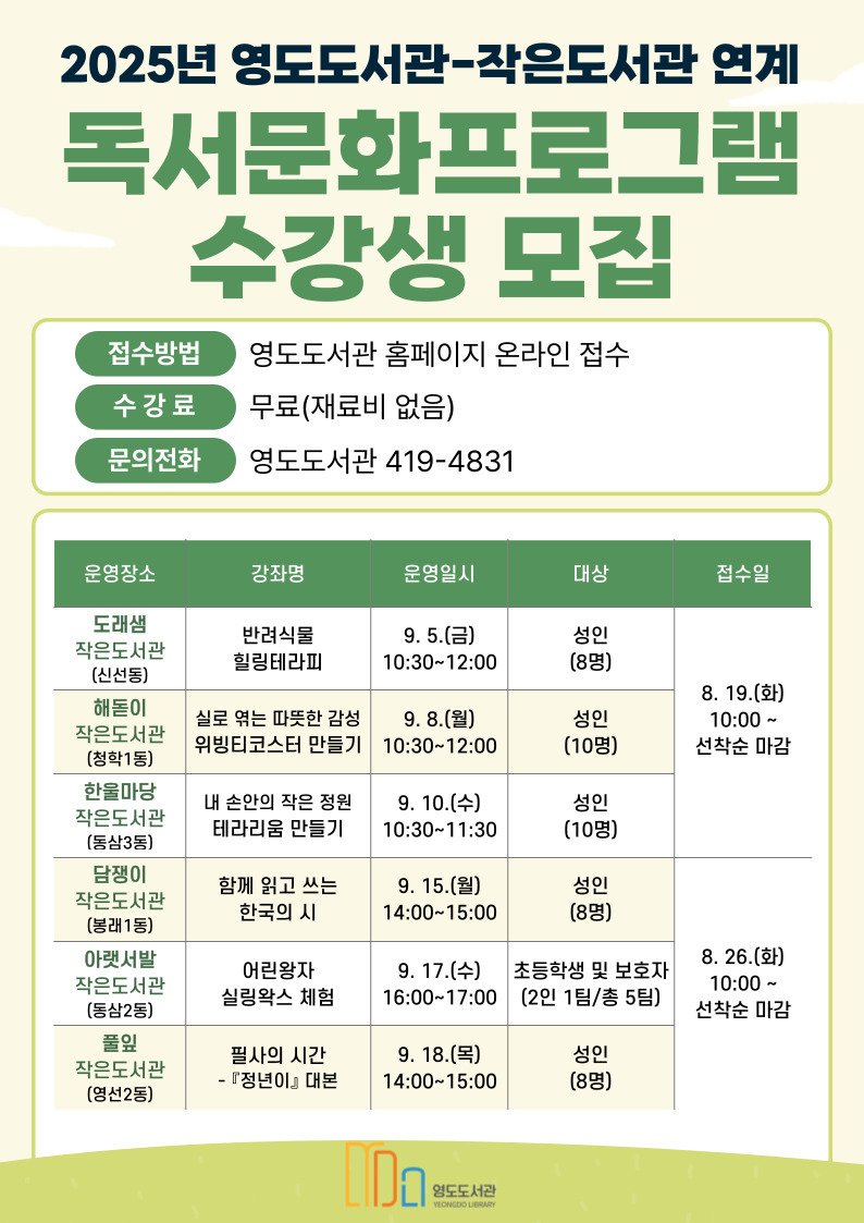 참가 신청은 8월19일과 26일 오전 10시부터 영도도서관 홈페이지에서 선착순으로 받을 예정이다.