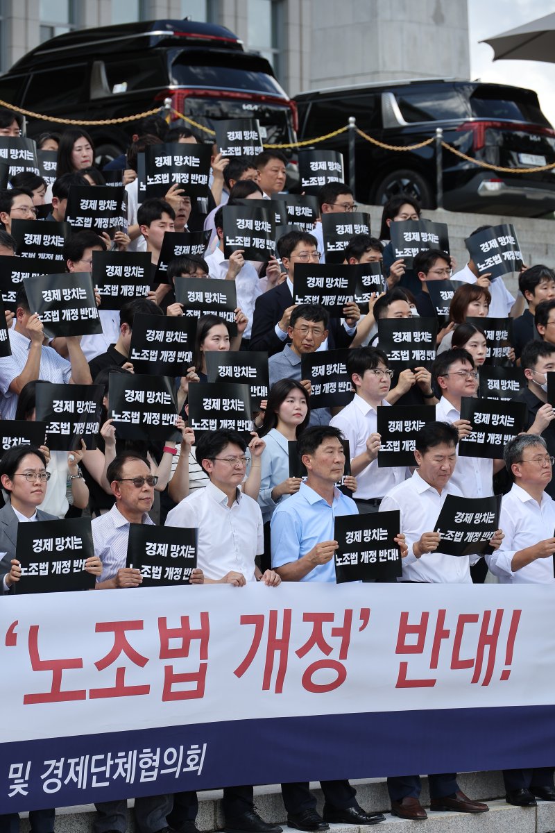 한국경영자총협회 및 대한상공회의소·한국경제인협회·한국무역협회·중소기업중앙회·한국중견기업연합회 등 경제6단체와 지방 경총, 자동차, 조선해양, 건설, 철강, 석유, 배터리 등 업종별 단체 대표 등 200여명은 이날 오후 국민의힘 김형동 의원과 함께 국회 본관에서 노란봉투법 추진 반대 결의대회를 열고 "사용자 범위(원청 기업)는 현행법을 유지할 것이며, 노동쟁의 대상에서 '사업경영상 결정'만은 반드시 제외해 달라고 수차례 호소했으나 국회가 경제계의 요구는 무시한 채 노동계의 요구만을 반영해 법안 처리를 추진한 점을 강력히 규탄한다"고 밝혔다. 경제6단체가 전날 사용자 범위 확대 반대 및 법 시행 1년 이상 유예 등 '3대 사항'을 요청했으나 여권의 묵살에 법안 수정 '촉구'에서 '규탄'으로 대응 수위를 높인 것이다. 경제계는 "기업의 사업경영상 결정까지 노동쟁의 대상으로 삼아 우리 경제를 위태롭게 하는 법안"이라며 "법 통과 시 사용자 범위가 무분별하게 확대되면 원·하청 간 산업생태계가 붕괴되고, 국내 산업 공동화 현상이 현실화될 것"이라고 강조했다.