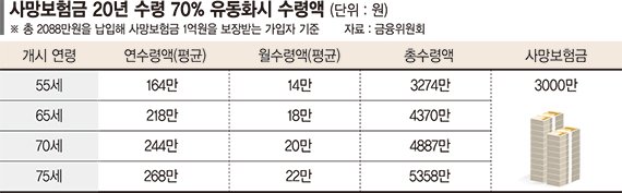 보험사는 가입자들의 선택을 돕기 위해 유동화 비율과 기간에 따른 지급금액 비교결과표를 제공할 계획이다. 금융위에 따르면 2088만원을 납입해 '사망보험금 1억원'을 보장받는 55세 가입자가 '20년 수령, 70% 유동화'를 선택할 경우 20년 동안 월 평균 14만원을 받고, 사망보험금으로 3000만원을 받을 수 있다. 75세의 경우 월 평균 22만원, 사망보험금 3000만원을 받게 된다.