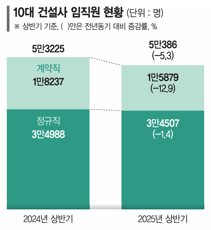 부동산 경기 침체로 국내 10대 건설사에서 지난 1년간 임직원이 3000명 가까이가 줄어든 것으로 나타났다. 감소 인원의 80% 이상이 계약직으로, 불황의 타격이 취약 고용 형태에 집중된 것으로 분석된다.