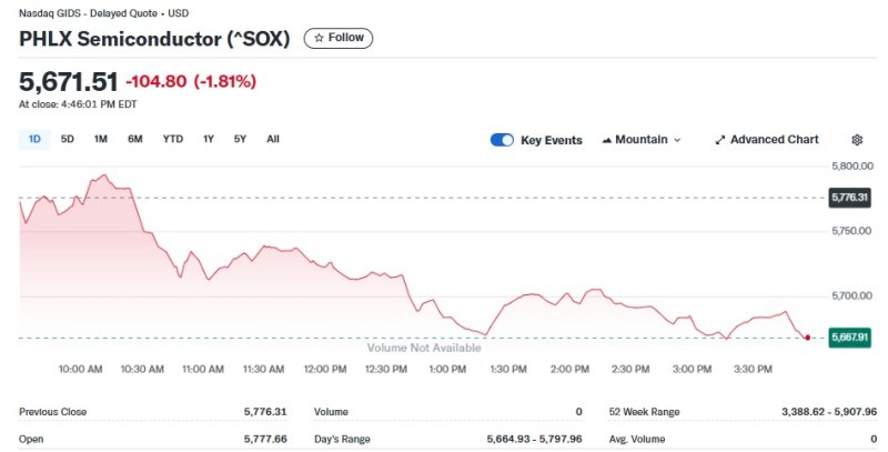19일(현지 시각) 뉴욕증시에서 반도체지수는 1.81% 하락한 5671.51포인트를 기록했다.