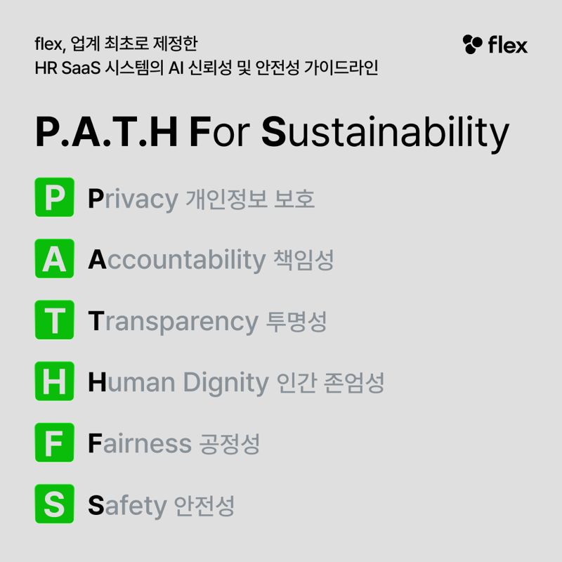 가이드라인의 핵심은 플렉스가 제시한 6대 윤리원칙 ‘P.A.T.H. For Sustainability’다. 이는 개인정보 보호(Privacy), 책임성(Accountability), 투명성(Transparency), 인간 존엄성(Human Dignity), 공정성(Fairness), 안전성(Safety)의 영문 머리글자를 딴 것이다. '노동의 가치와 인간의 고유성을 존중한다'는 철학을 담았다.