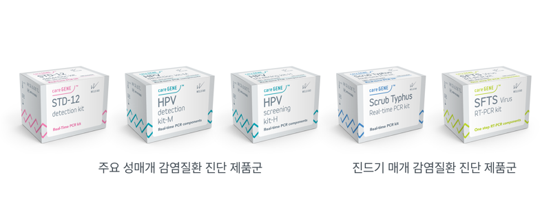 인증을 받은 제품은 △주요 성매개 질환 원인 병원체 12종을 동시 검출할 수 있는 '케어진 에스티디12 디텍션 키트' △인유두종바이러스(HPV) 14종을 선별할 수 있는 '케어진 에이치피브이 스크리닝 키트 에이치' △고위험군 7종과 저위험군 18종 HPV 유형을 선별할 수 있는 '케어진 에이치피브이 디텍션키트 엠' △쯔쯔가무시증과 중증열성혈소판감소증(SFTS)을 진단하는 '케어진 스크럽타이푸스 리얼타임 피씨알 키트' 등이다.