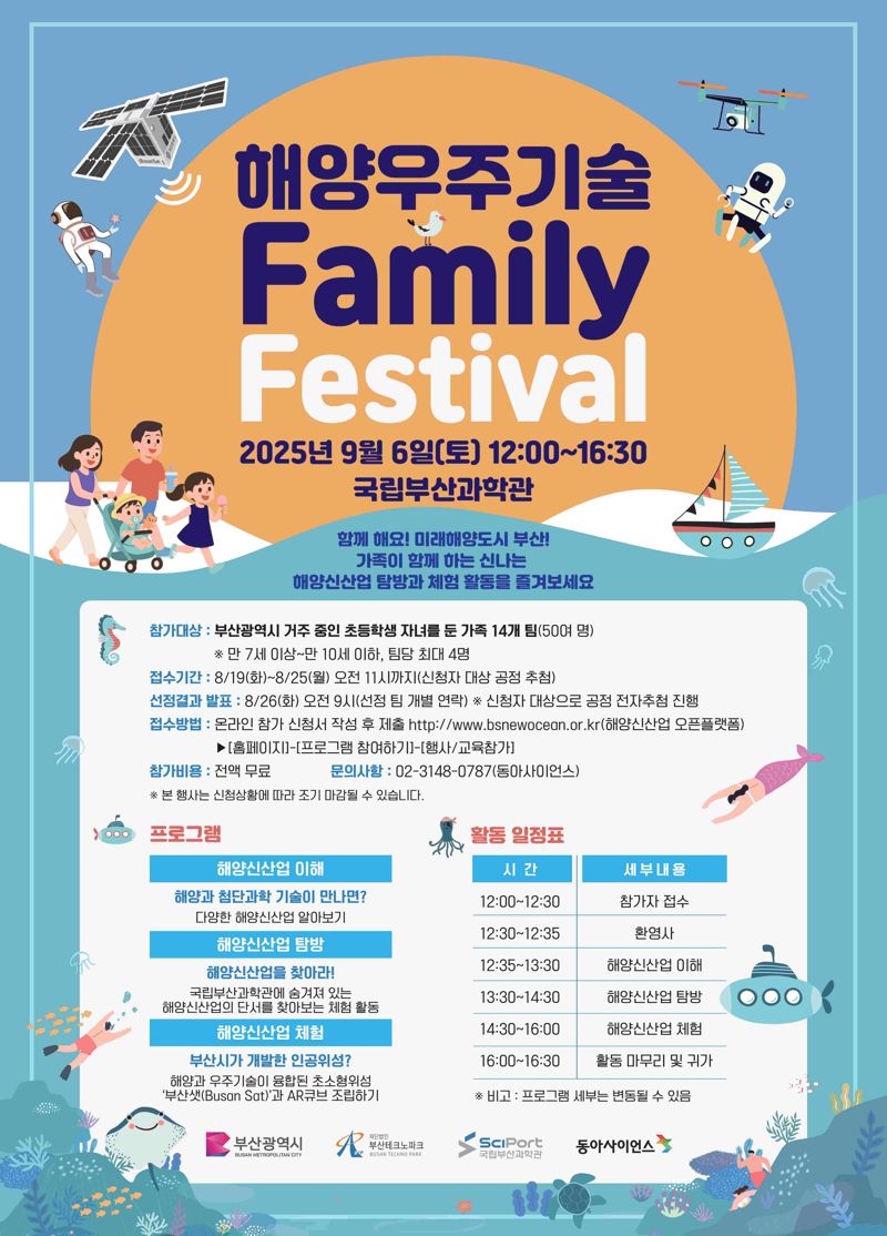 [파이낸셜뉴스] 부산의 다양한 해양·우주기술을 살펴볼 수 있는 ‘부산 해양·우주기술 가족 페스티벌’이 내달 6일 국립부산과학관에서 개최된다.