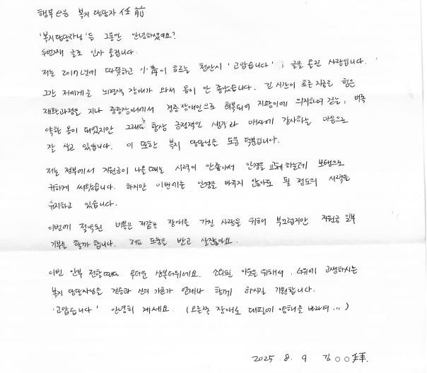 20일 천안시에 따르면 중증장애인이면서 기초생활수급자인 김모씨는 편지를 통해 과거 생활의 어려움을 천안시 복지서비스를 통해 극복할 수 있었다고 밝히며 이 과정에서 도움을 준 복지담당자에게 감사를 표했다.