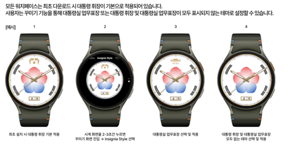 한편, 대통령실은 국민 요청을 반영해 대통령 휘장을 활용한 애플워치용 배경 화면 4종도 함께 제작해 △안드로이드 스마트워치용 워치페이스 5종 △애플워치용 7종 △스마트폰 공용 배경화면 3종으로 구성된 총 15종의 디지털 굿즈를 공개했다.