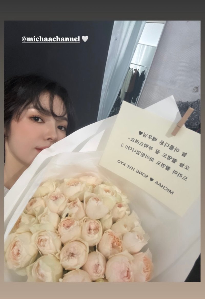 사진 속 송혜교는 큰 꽃다발을 들고 은은한 미소를 짓고 있다.