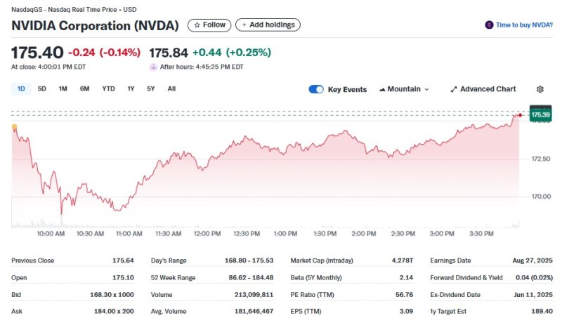 20일(현지 시각) 뉴욕증시에서 엔비디아는 0.14% 하락한 175.40달러를 기록했다. 이로써 시총도 4조2780억달러로 줄었다.