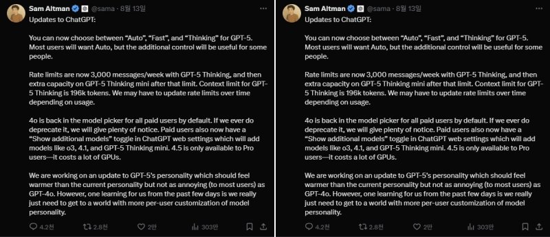 올트먼은 "특정 AI 모델을 쓰는 이용자들의 애착이 예상했던 것보다 훨씬 강하다는 걸 배웠다"며 "갑작스럽게 기존 모델을 없앤 것은 실수였다"고 인정했다. 이어 "GPT-5 모델의 성격은 이용자들이 각자 커스터마이제이션(customization)할 수 있도록 계속 업데이트할 예정"이라며 "대부분 이용자는 GPT-5를 더 좋아하게 될 것"이라고 전했다.