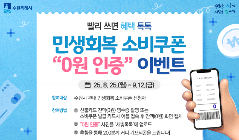 수원시 관계자는 "민생회복 소비쿠폰이 수원시 골목상권 활성화에 도움이 되길 바란다"며 "지역경제를 활성화할 수 있는 이벤트와 지원책을 지속해서 마련하겠다"고 말했다.