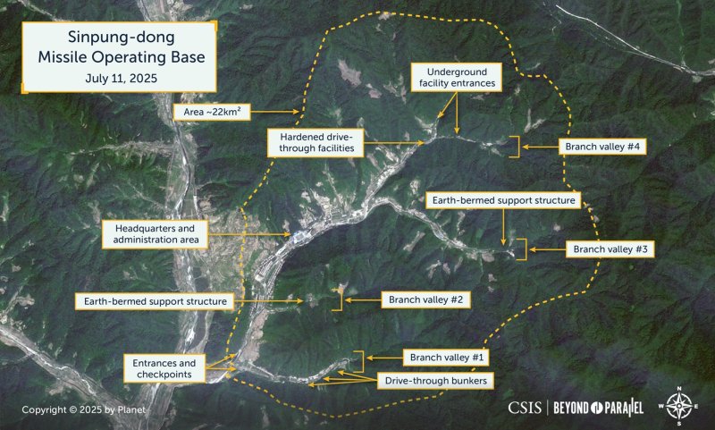 20일(현지시간) 미국 싱크탱크 전략국제문제연구소(CSIS) 산하 한반도 문제 전문 사이트 '분단을 넘어(Beyond Parallel)'는 지난달 11일 촬영된 위성 사진을 근거로 지하 입구, 지하 시설, 지휘부, 지원용 구조물 등으로 구성된 북한 신풍동 미사일 기지를 소개하는 보고서를 공개했다.