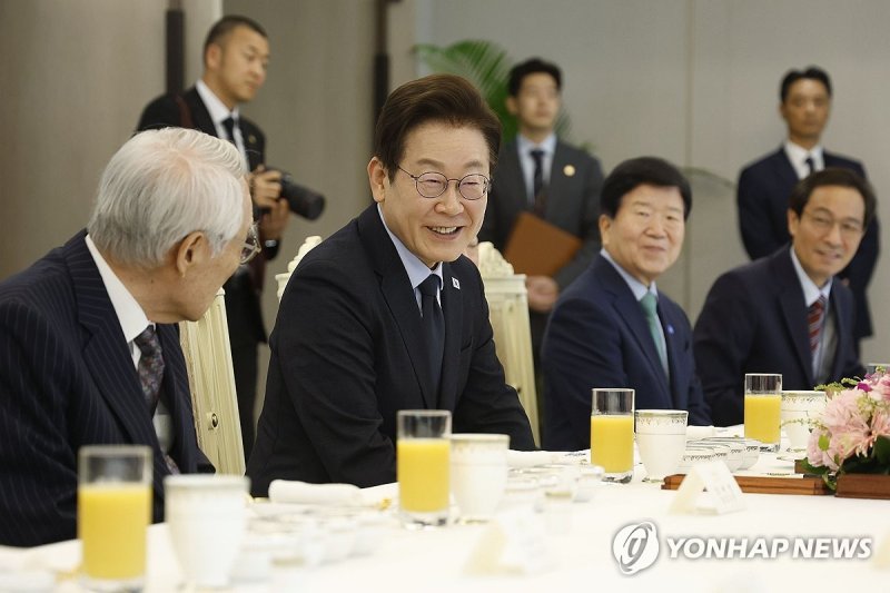 이 대통령은 이날 용산 대통령실에서 민주당 상임고문 오찬 간담회를 갖고 "우리 고문님들이 다 애써주신 덕에 저희가 이렇게 새로운 정부의 책임을 맡게 됐다"며 이같이 말했다.