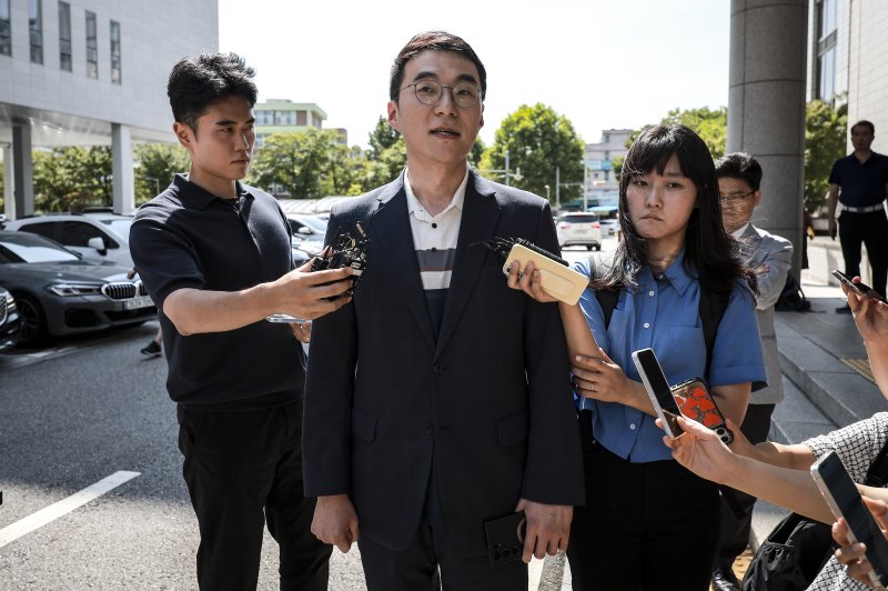 [서울=뉴시스] 정병혁 기자 = '허위 재산 신고'로 재판에 넘겨진 김남국 대통령실 국민디지털소통비서관이 21일 서울 양천구 서울남부지방법원에서 열린 항소심 선고를 마친 뒤 취재진 질문에 답하고 있다. 이날 서울남부지법 형사항소3-1부(임선지 조규설 유환우 부장판사)는 위계공무집행방해 혐의로 기소된 김 비서관에 대해 1심과 같이 무죄를 선고했다. 2025.08.21. jhope@newsis.com