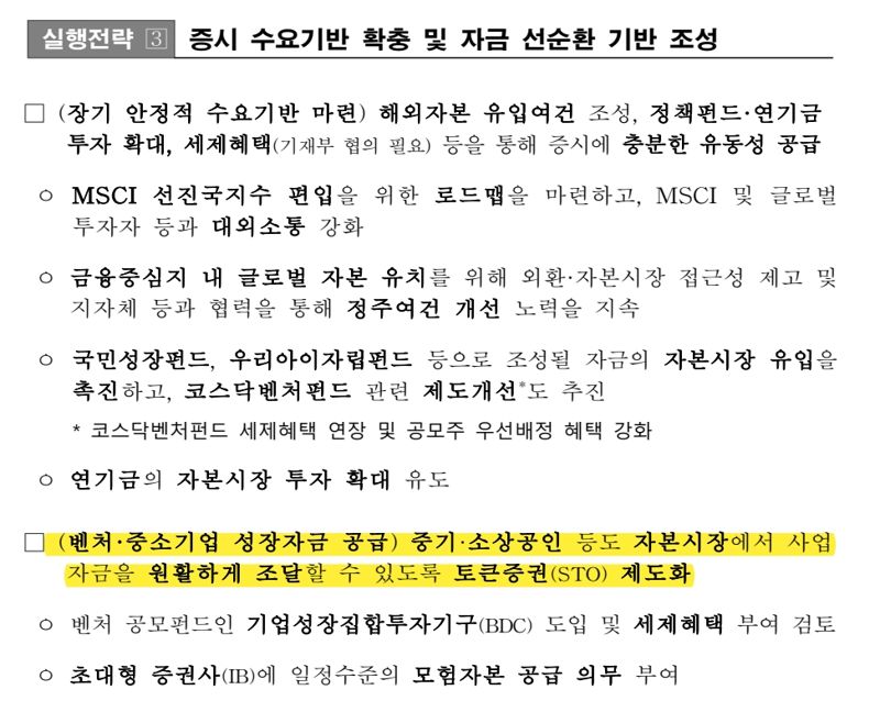 정부는 12대 중점 전략과제인 ‘코리아 프리미엄 실현으로 코스피 5000시대 도약’ 부문에서도 토큰증권(STO)을 지목했다. 중소기업 및 소상공인도 자본시장에서 사업자금을 원활하게 조달할 수 있도록 토큰증권(STO)을 제도화할 방침이다.