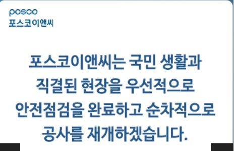 회사 관계자는 "그동안의 뼈아픈 경험을 계기로 업계 전반의 안전관리 기준을 한층 강화하고, 건설산업의 새로운 안전 패러다임을 선도해 나가겠다"며 "안전이 곧 경쟁력이라는 인식을 바탕으로, 국민 생활의 안심과 직결된 현장의 가치를 최우선에 두고 지속가능한 미래 건설시장의 표준을 만들어갈 것"이라고 밝혔다. 한편 포스코이앤씨 고속도로 공사 현장에서 감전 사고를 당한 30대 미얀마인 근로자의 건강이 회복세에 들어간 것으로 전해졌다.