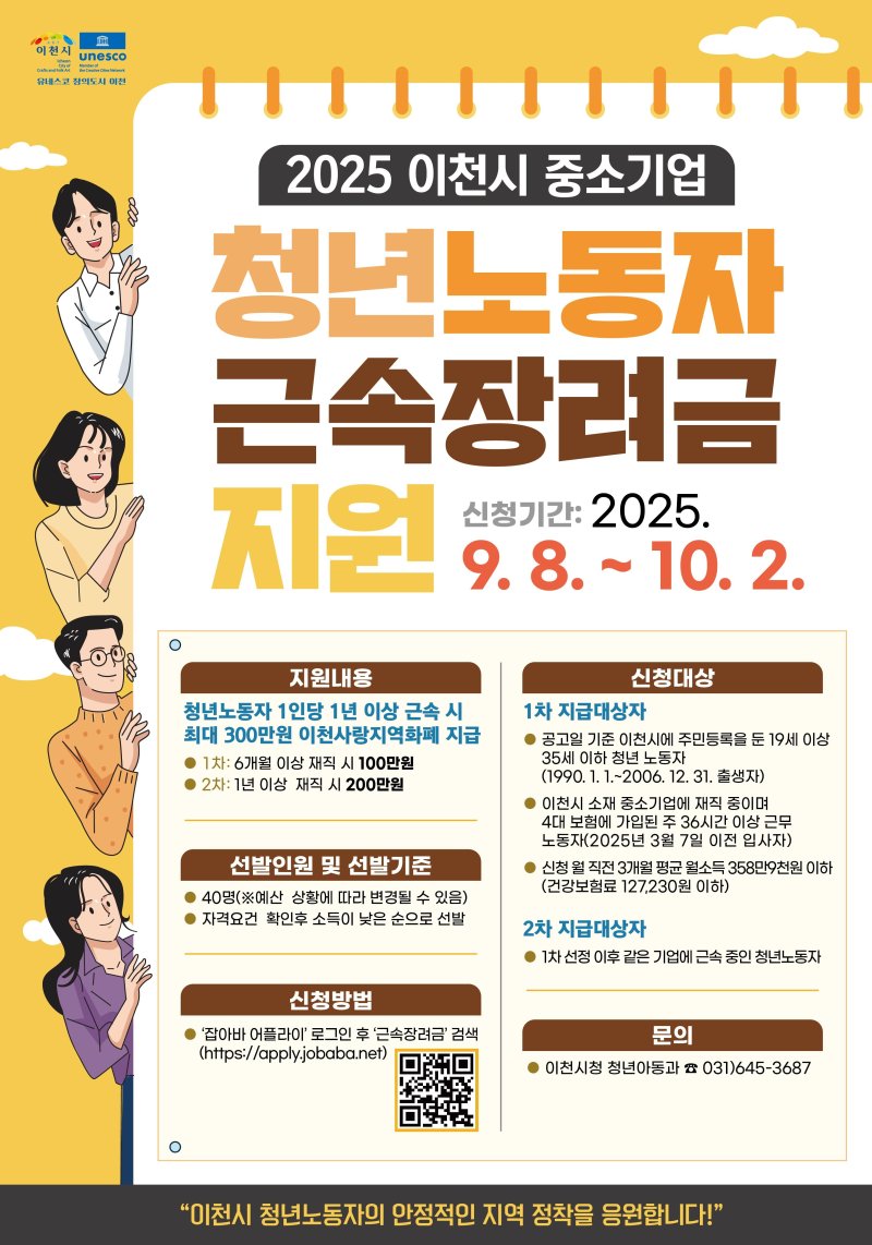 신청 자격은 △이천시에 거주하는 19세 이상 35세 이하 청년(1990년 1월 1일~2006년 12월 31일 출생자) △관내 중소기업 재직자로 4대 보험 가입 및 주 36시간 이상 근무 노동자 △2025년 6월부터 2025년 8월까지 3개월 평균 월 소득 358만 9000원(건강보험료 12만 7230원) 이하의 요건을 갖추어야 한다.