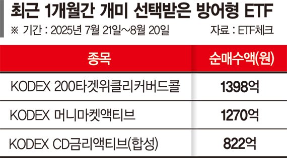 커버드콜ETF와 함께 파킹형ETF에도 자금이 빠르게 유입되고 있다. 개인 투자자는 최근 1개월간 'KODEX 머니마켓액티브'를 총 1270억원어치 순매수했다. 전체 ETF 중 순매수 2위 규모다. 해당 상품은 초단기 채권, 기업어음(CP) 등 신용도가 높은 유동성 자산에 투자하는 머니마켓펀드(MMF)의 운용 방식을 기반으로 설계된 ETF다.