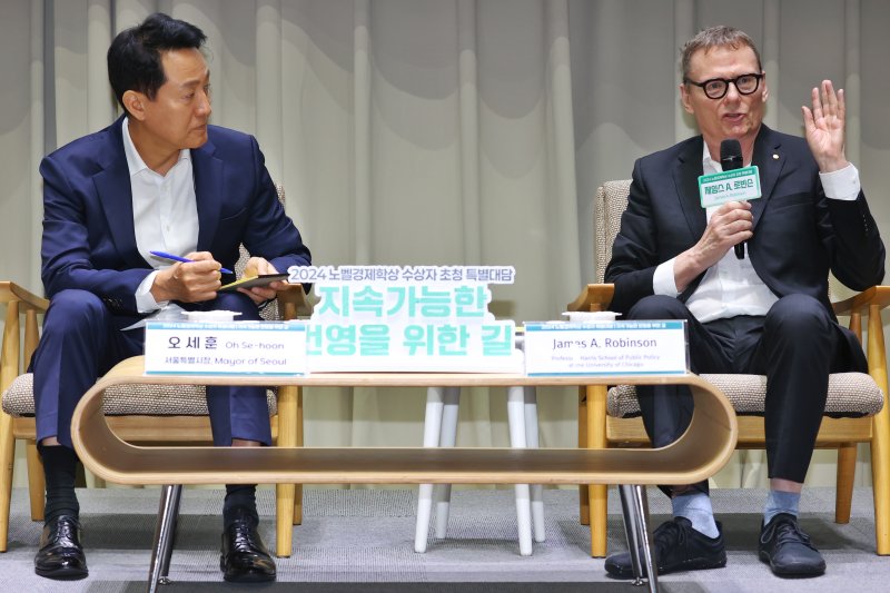 이어 오 시장과 로빈슨 교수는 '지속 가능한 성장과 번영을 위한 제도'를 중심으로 대담을 나눴다. 오 시장은 로빈슨 교수가 주장한 '번영의 공유' 개념이 서울시 '약자와의 동행' 정책에도 녹아 있다고 밝혔다. 오 시장은 "적당한 불평등은 경쟁을 자극하는 에너지가 될 수 있지만 패자부활전이 없는 사회는 건강하지도 않고 발전도 어렵다"며 "계층이동 사다리를 복원해 사회적 에너지를 되살리는 것이 '약자와의 동행'이 가진 효용"이라고 설명했다.