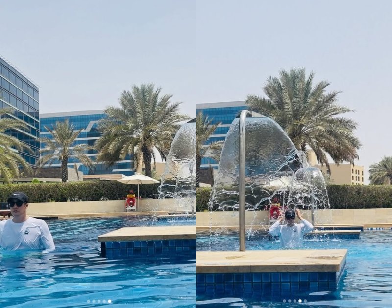 사진 속 소지섭은 수영장에서 캐주얼한 차림으로 물놀이를 즐겼다.