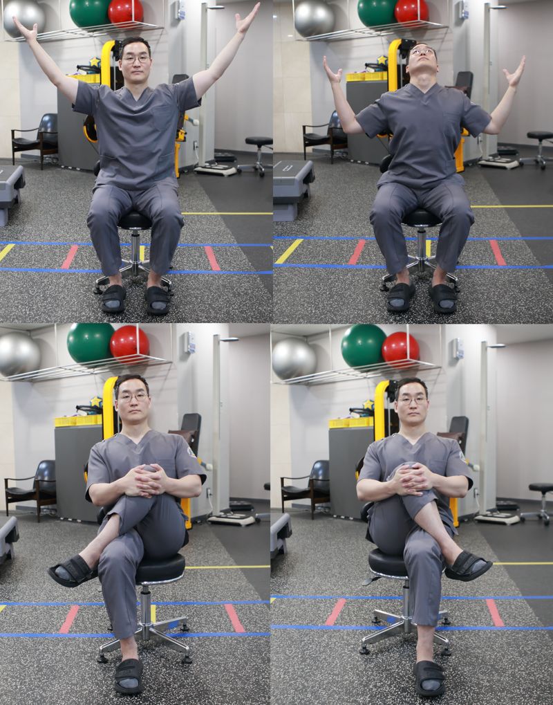△가슴펴기 스트레칭 : 양팔을 아래로 당기듯 내려 견갑골을 모으고 고개를 뒤로 젖힌다. 10초씩 5회 반복하면 목·가슴·허리 근육 이완에 효과적이다.