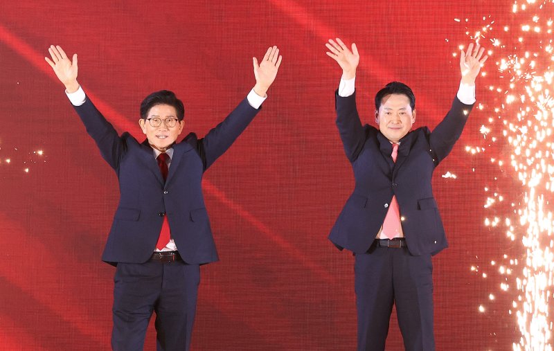 국민의힘은 전날 충북 청주 오스코에서 전당대회를 열고 최종 당권 주자로 김문수·장동혁 후보를 확정했다. '찬탄'(탄핵 찬성) 안철수·조경태 후보는 나란히 고배를 마셨다.