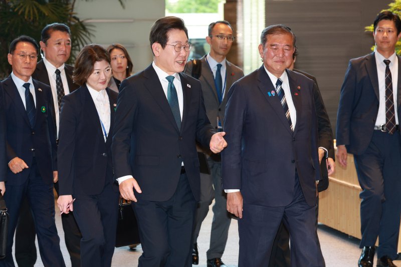 [도쿄(일본)=뉴시스] 고범준 기자 = 이재명 대통령과 이시바 시게루 일본 총리가 23일(현지 시간) 일본 도쿄 총리 관저에서 정상회담을 하기 위해 이동하고 있다. 2025.08.23. bjko@newsis.com <저작권자ⓒ 공감언론 뉴시스통신사. 무단전재-재배포 금지.> /사진=뉴시스화상 저작권자ⓒ>