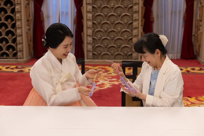 이시바 여사가 ‘사람과 사람의 인연을 굳게 맺는다’는 일본 전통 매듭의 의미를 설명하자, 김 여사는 한국 전통 매듭은 좋은 기운을 불러들이고 성공과 안녕을 기원하는 뜻을 담고 있다고 답했다.
