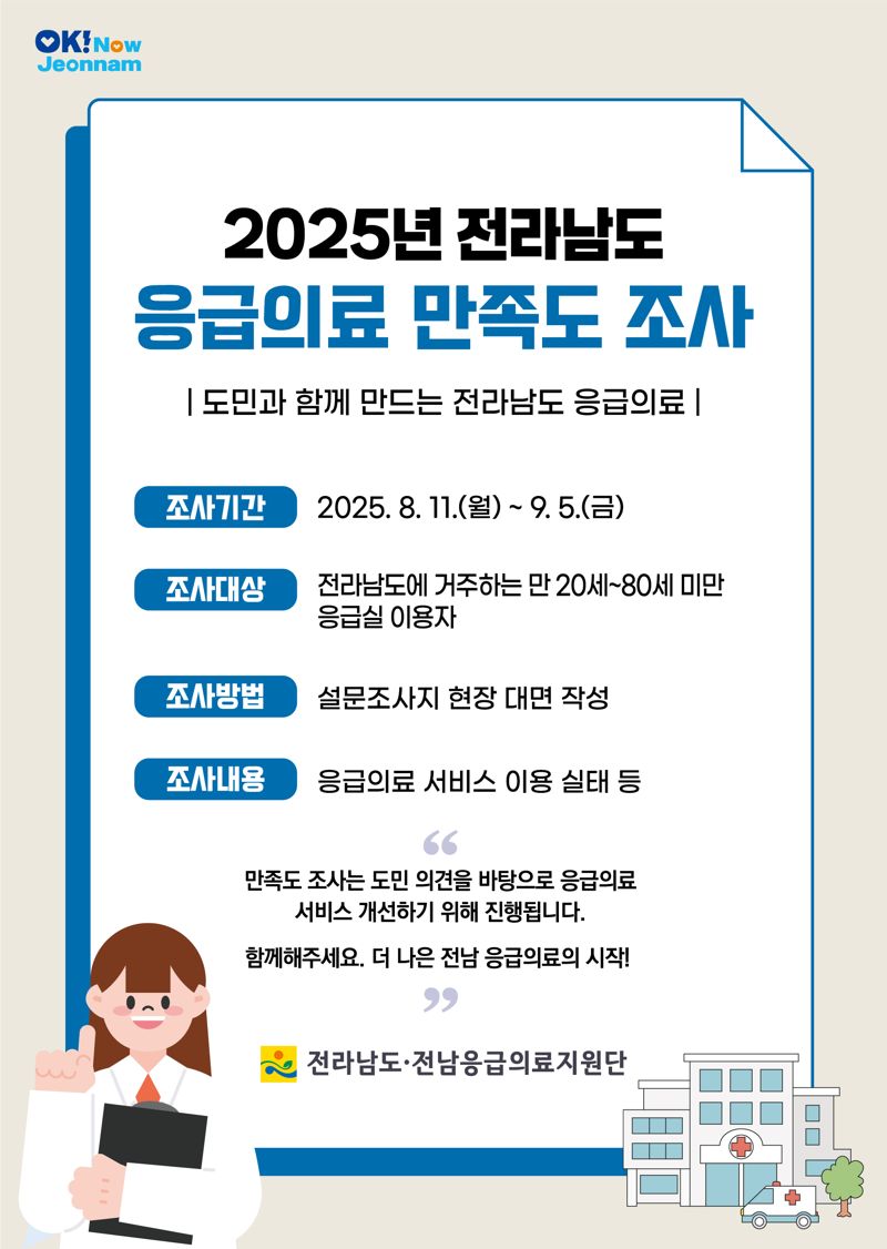 전남도는 응급실을 더 안전하고 따뜻하게 관리토록 하기 위해 오는 9월 5일까지 지역 응급의료기관 38개소 응급실 이용객을 대상으로 '2025년 응급의료 만족도 조사'를 실시한다고 밝혔다.