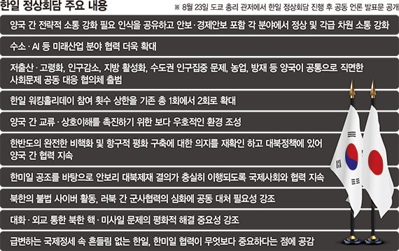 양국 정상은 셔틀외교의 조기복원에 의미 부여를 했다. 그동안 한일 양국 관계가 소원할 때는 미국이 주도해 한미일 삼국 협력을 이끌어내는 모양새가 연출됐다. 하지만 이번 이 대통령의 방일을 통해 한국이 주도해 일본과의 관계를 먼저 다지고, 이후 미국을 방문해 한미일 협력을 강화할 수 있는 여건이 조성됐다.
