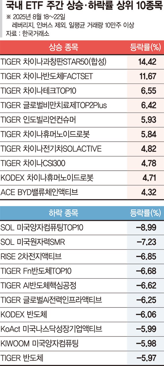 24일 한국거래소에 따르면 지난 18일부터 22일까지 ETF 시장에서 가장 높은 수익률을 기록한 상품은 'TIGER 차이나과창판STAR50(합성)'으로 14.42% 급등했다. 'TIGER 차이나반도체FACTSET'(11.67%), 'TIGER 차이나테크TOP10'(6.55%), 'TIGER 글로벌비만치료제TOP2Plus'(6.42%), 'TIGER 인도빌리언컨슈머'(5.93%) 등이 뒤를 이었다. 이 밖에도 'TIGER 차이나휴머노이드로봇'(5.84%), 'TIGER전기차SOLACTIV'(7.82%) 등이 상위권에 오르며 톱10 가운데 7개를 중국 테마가 차지했다.
