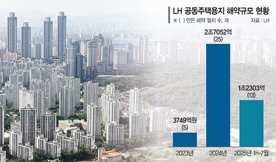 LH 자료를 보면 공동주택용지 해약은 2023년부터 급증했다. 세부적으로 보면 2022년에는 2건 382억원에 불과했다. 하지만 2023년에는 5개 필지(해약금액 3749억원)으로 늘었고, 2024년에는 25개 필지 2조7052억원으로 급증했다. 올해 들어 7월까지도 13건 1조2303억원을 기록하고 있다.