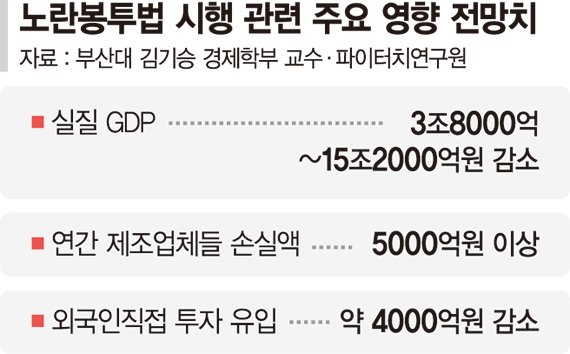 부산대 김기승 경제학부 교수는 최근 미래노동법혁신연구회 토론회에서 연간 파업건수가 10%·근로 손실 일수 15% 증가 가정 시 제조업체들의 직접적 손실액만 5000억원 이상으로 추산했고, 노사 관계 불확실성에 따른 직접투자 축소로 약 10조원의 GDP 손실이 발생할 수 있다고 전망했다. 이에 따른 외국인 직접투자 유입액도 약 4000억원 감소할 것으로 분석했다.