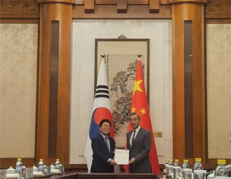 (베이징=뉴스1) 정은지 특파원 = 중국을 방문한 대통령 특사단이 24일 오후 베이징 댜오위타이 국빈관에서 왕이 중국 외사판공실 주임 겸 외교부장과 만나 이재명 대통령의 친서를 전달하고 시진핑 국기주석에 오는 10월 말 경주에서 열리는 아시아태평양경제협의체(APEC) 정상회의의 참석을 요청했다.