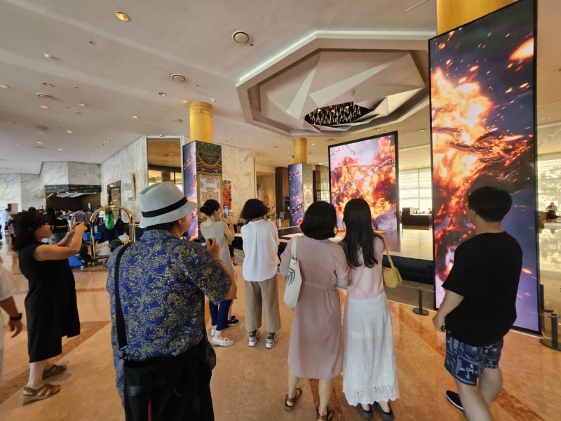 [안동=뉴시스] 류상현 기자 = 경북도가 지난 24일 힐튼호텔 경주 중앙로비에서 AI, 첨단 미디어, 스틸아트 기법으로 경주의 문화유산을 구현한 특별전시 '빛으로 피어나는 신라'를 선보였다.