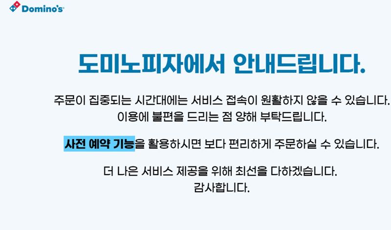 도미노피자는 공지를 통해 "주문이 집중되는 시간대에는 서비스 접속이 원활하지 않을 수 있다"며 "이용에 불편을 드리는 점에 대해 양해 부탁드린다"고 밝혔다.