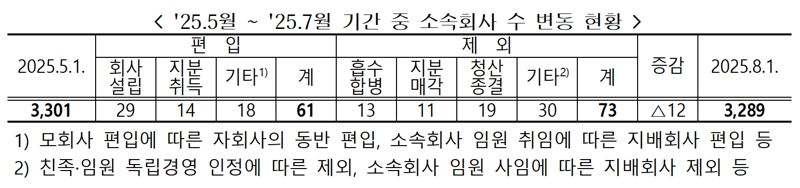 25일 공정거래위원회가 공개한 ‘대규모기업집단 소속회사 변동 현황(2025년 5~7월)’에 따르면, 자산 5조원 이상 공시대상기업집단(92개)의 전체 소속회사는 3301개(5월 1일 기준)에서 3289개(8월 1일 기준)로 12개 줄었다. 3개월간 총 61개사가 새로 계열에 편입됐고, 73개사는 제외됐다.