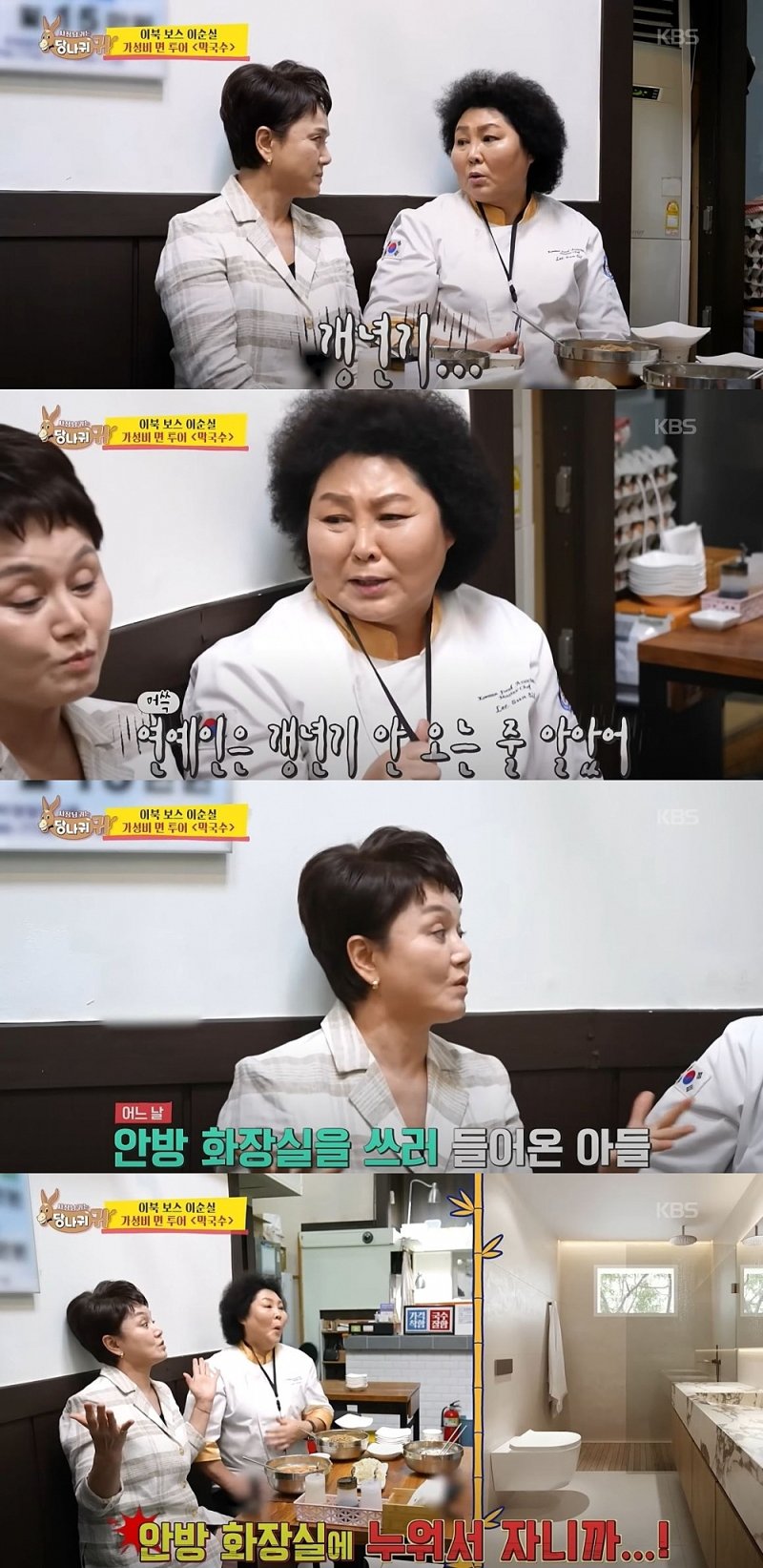 [서울=뉴시스] 코미디언 이경실이 지난 24일 방송한 KBS 2TV 예능 프로그램 '사장님 귀는 당나귀 귀'에 게스트로 출연해 북한 출신 외식 사업가 이순실과 함께 막국수를 먹었다. (사진=KBS 2TV '사장님 귀는 당나귀 귀' 캡처) 2025.08.25. photo@newsis.com *재판매 및 DB 금지
